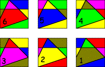 passez les 3 du dessus vers le dessous . Cela permet de ne pas retrouver tout de suite une même couleur dans deux morceaux adjacents. TRUC : Les bords du bloc deviennent irréguliers; pas de problème, on les retaillera en fin de parcours. |