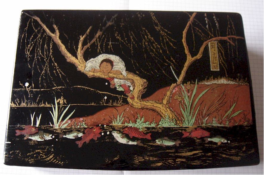 | Voici une superbe boite avec fermeture à ressort et décor laqué "japonisant" de la fin du XIXème. On pourrait penser à quelque cadeau rapporté par un cousin marin.... mais la vérité est beaucoup plus terre à terre! Ces objets en papier maché laqué ont tous été produits à Pont à Mousson dans l'usine Adt. Une spécialité locale auquel un musée est consacré et qui vaut la visite compte tenu des incroyables pièces exposées comme vous pourrez le voir sur ce petit film. |