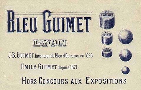 A une époque où les lessives se faisaient à la main, puis plus tard avec une lessiveuse, une époque de linge naturel (chanvre, lin puis coton) il était parfois difficile d'obtenir une blancheur idéale. Le sèchage "sur le pré" était une solution mais on avait aussi remarqué qu'une très légère teinture de bleu permettait de raviver le blanc du linge. Ce vrai bleu, c'était le bleu d'outremer et pendant des siècles il n'y avait qu'une façon de l'obtenir: c'était de broyer du lapis-lazuli - méthode peu simple et surtout hors de prix. En 1828, un chimiste de Lyon, Jean-Baptiste Guimet a inventé le bleu d'outremer artificiel. Il a gagné le prix de 6000 Francs qu'avait mis en jeu, en 1824, la Société d'Encouragement pour l'Industrie Nationale. Cette invention a permis de diviser le prix de fabrication par 10 et donc de permettre une large utilisation en France mais aussi à l'exportation. L'un des noms anglais pour ce bleu est "bleu de Paris" - Paris blue! Si l'histoire de cet industriel (également collectioneur - voir Musée Guimet) vous intéresse plus précisément, je vous conseille de vous reporter à cette page et également sur celle-ci pour la partie américaine. |