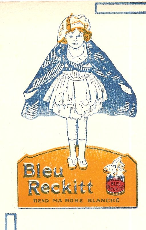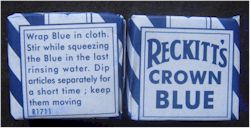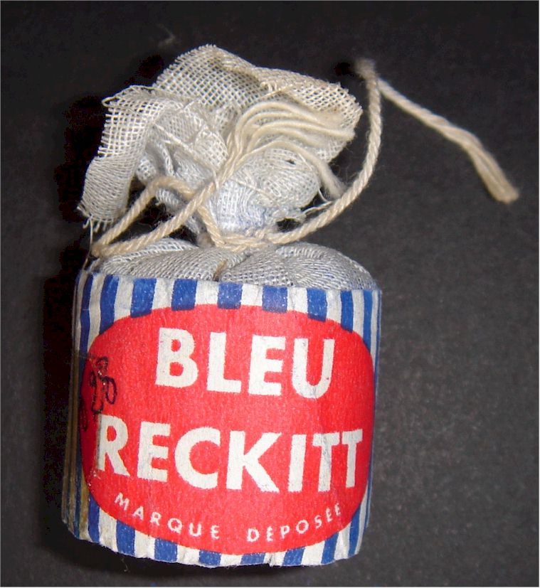 | Le bloc Reckitt ci-dessous était encore en usage assez récemment (jusque dans les années 60). Aujourd'hui, les azurants sont intégrés dans les poudres à lessive mais dans certaines, on voit encore les petits grains bleus du produit. | |